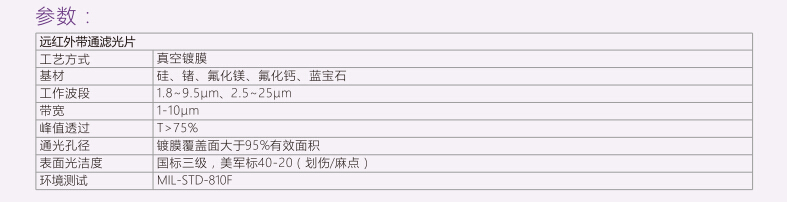 我司生產(chǎn)的遠紅外帶通濾光片中性波長(cháng)一般在2.0μm~25μm范圍內,采用硅、鍺、藍寶石、氟化鎂、氟化鈣為基材鍍膜。濾光片峰值可達75%以上。